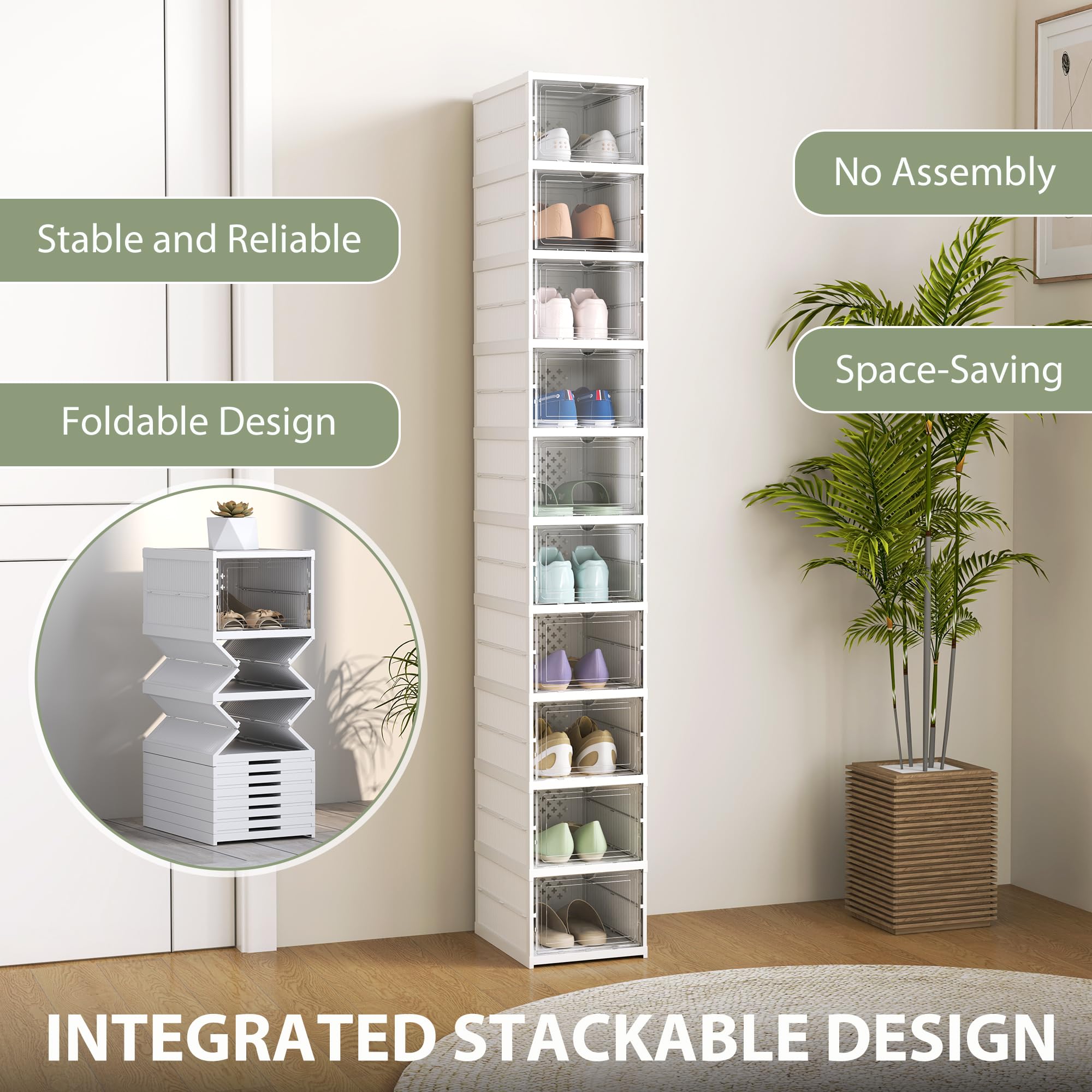 HOMCOM 10 Pack Foldable Shoe Organizer, Plastic No Assembly Stackable Shoe Storage Box with Clear Door, Space Saving, Fit up to US Size 10, White